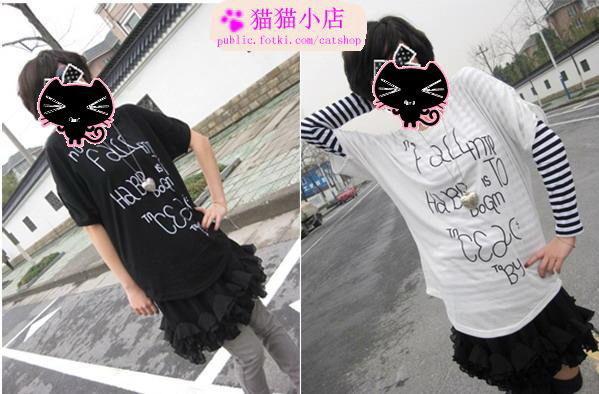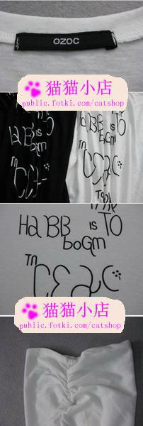 ozoc~字母印花蝙蝠袖棉T $39 品牌:ozoc(目前的货是换标的哦) 尺寸:肩无限制 胸104 长64cm 质地:棉 颜色:黑/白 备注:字母印花T哦~感觉春天的时候搭配一件打底T.非常的日系哦~ 面料稍薄哦.但是很舒适哦~