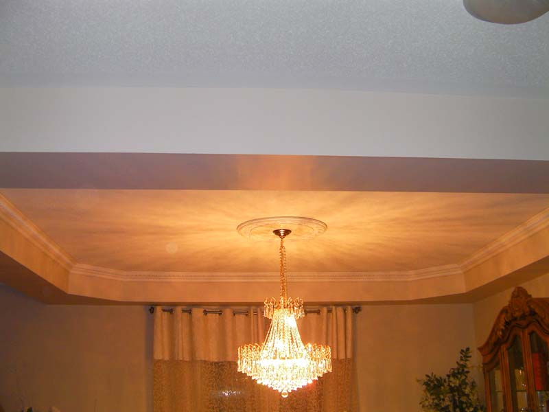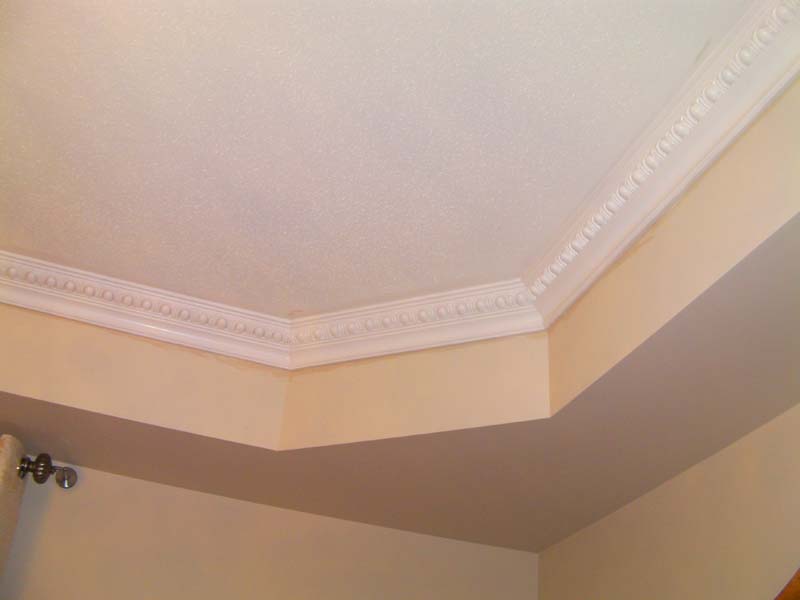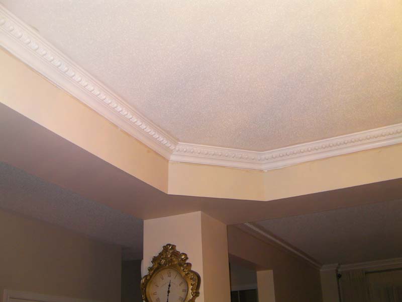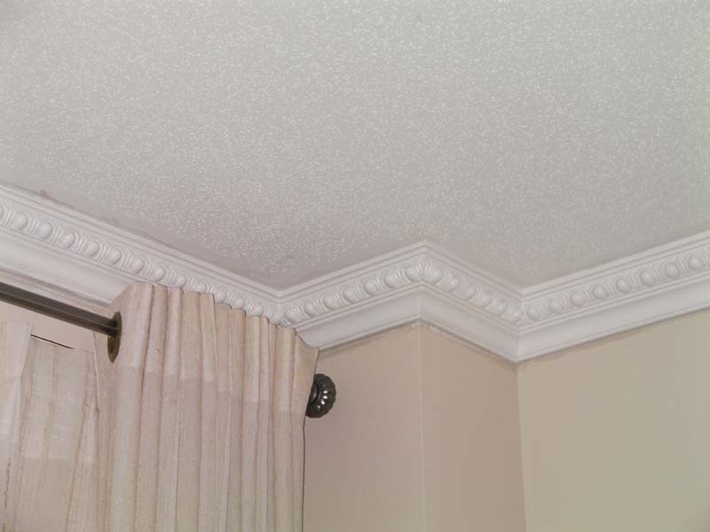 完成了两个房间,这是一个比较复杂的内外角。Crown moulding下面粘了些白油漆,以后会用与墙体验色相同的油漆覆盖。