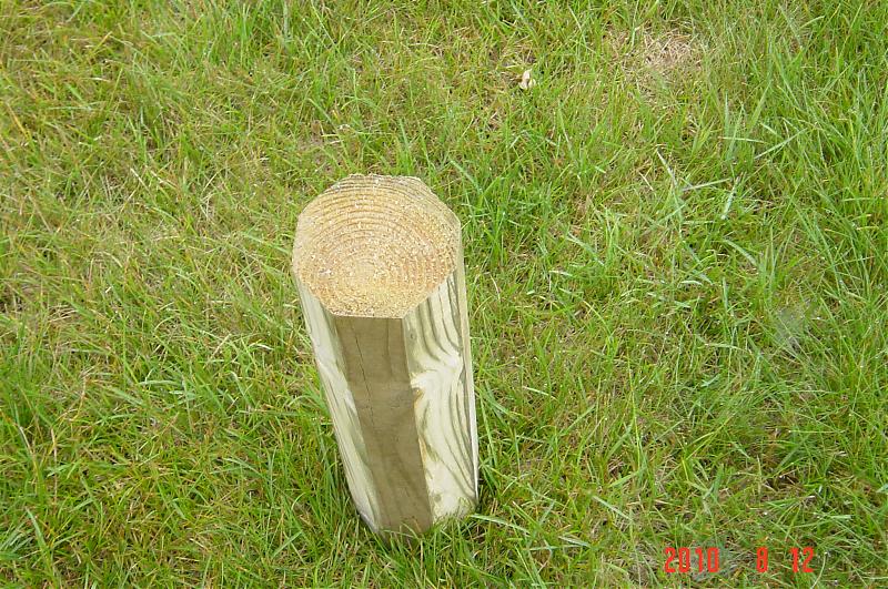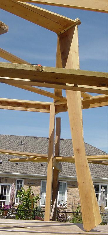 凉亭的顶对外观的影响还是很大的,大梁不管是放成20度还是30度,顶都是直上直下的,显得“很硬”。所以我的顶做成22.5度,但大梁的两端分别垫高,使顶先陡后缓,估计这样看着才有点味道,嘿嘿。 将2x6沿对角线锯开,放在顶端,低端则用2x4。
