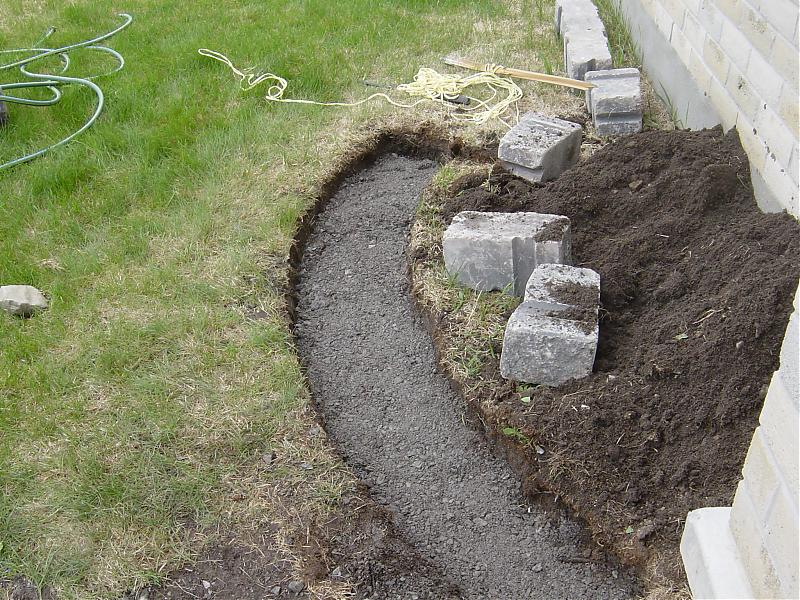 窗前的花坛也开始动工了。先用绳子摆个想要的弧形,然后按砖的宽度挖草皮,大概挖半尺深左右就可以了,之后填gravel,砸实后,再添stone dust。