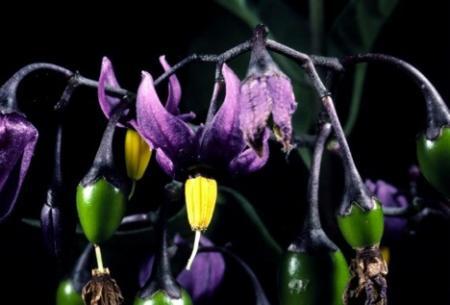 又叫黑樱桃、大龙葵和颠茄。其毒性来自全身各个部位,含有一种致命的生物碱--阿托品。误食该植物后,哪怕只是极少量也会很快发现失声、呼吸困 难和抽搐。由于其浆果甜美,孩子们经常会忍不住偷吃。奇怪的是,马群、鸟类、羊群和猪群似乎对它的毒性免疫。中毒后如果救治及时,服用催吐剂也可治愈。古 希腊历史学家普拉塔赫曾说:茄属植物曾消灭了大批军队,更有传奇说麦克白的部队用其美味的浆果作成美酒,毒倒了入侵的丹麦部队。