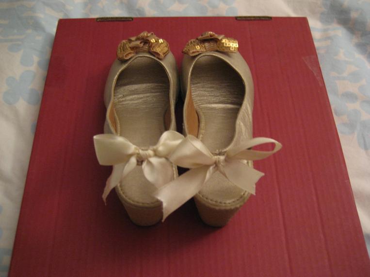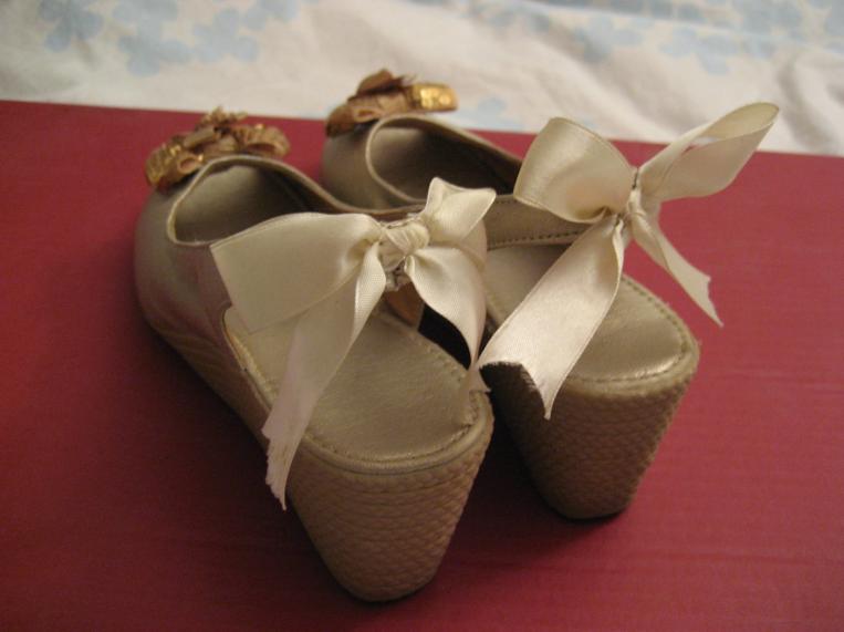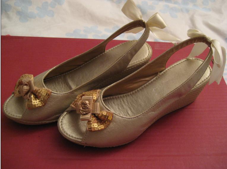 还有一双金色后系蝴蝶结坡跟鱼嘴单鞋在卖!
