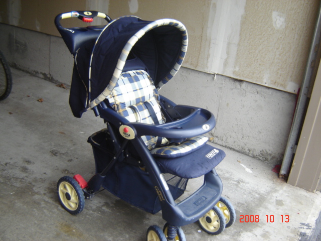 1. stroller是cosco牌子,在小孩子坐和躺之间有3个档次可调,不用的时候也很方便折叠好储存。$30,免费送stroller cover.