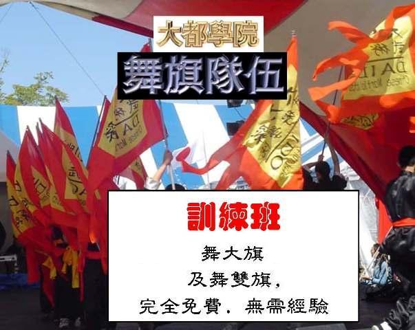為配合大都學院的武術隊的表演, 我們組織舞旗隊伍, 舞大旗及舞雙旗, 完全免費, 並借出絲綢表演服装。無需經驗 (有武術或舞蹈根底者更好)