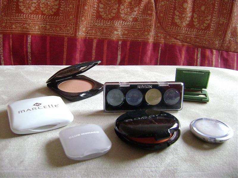 全部抛售15元 单卖3元 后排从左到右: Marcelle 浅色粉饼 Marcelle Bronzer 浅古铜色 Revlon 4色眼影 Clinique 小眼影 后排从左到右: Club Monaco 单色膏状眼影 Nacora 橘色粉饼,可做眼影 膏状眼影,银白色,可做眼影打量用 613-3029590