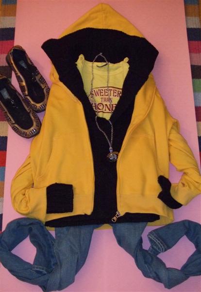 32.Champion正黄色连帽衫(NEW)Size:M $8 黄色字母TEE(9成新) $3 GAP牛仔裤(NEW)Size:6 $8 Teemix小羊皮金属色镶钻波鞋(国内天美意,RMB200左右,只穿过一次)Size:37 $20