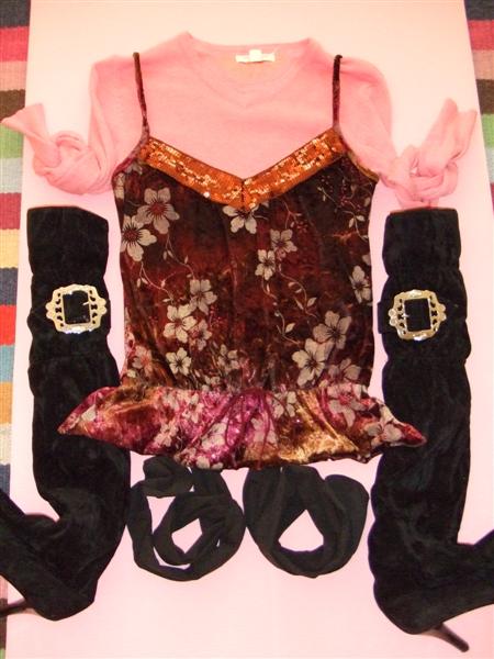 44.AE粉色纯棉TEE(9.7成新)Size:S $8 绒面亮片吊带(NEW)Size:S $8 黑色两穿长筒高跟靴(NEW 高度到膝盖以上,也可以放下去穿,2种感觉,跟高约7CM)Size:37 $10