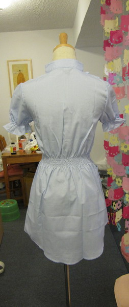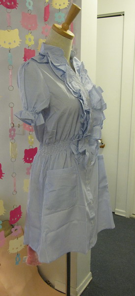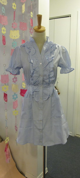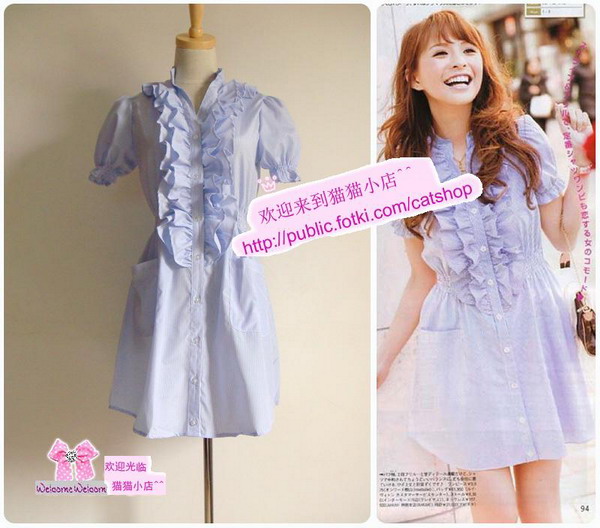 最后一件啦--日单.杂志款^^清新甜美荷叶边衬衫式连衣裙 S ●吊牌:主标、无吊牌、洗标 面料: 50%棉 50%涤纶 尺码:S S: 胸围84CM 袖长21CM 肩宽34CM 总长80CM (实物的颜色比较接近第一张图片的颜色哦,超 级凉爽的纯蓝色呢)
