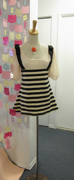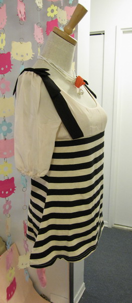 甜美 泡泡袖 条纹蝴蝶结 短袖小衫 泡泡袖,袖口有橡皮筋收口,恰到的长度,可以很好的掩盖肉肉的手臂 上身效果很好,很显瘦哦, 猫猫强力推荐~~~~ 胸围86CM 袖长28CM 肩宽36CM Y长62CM