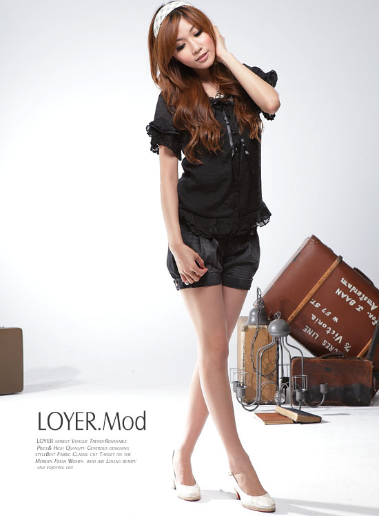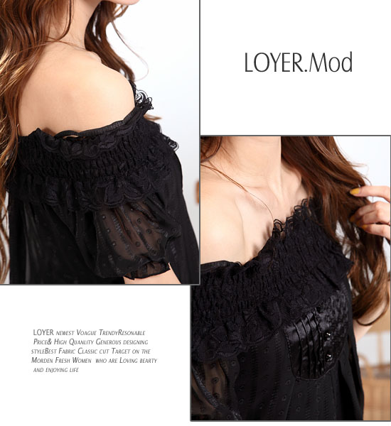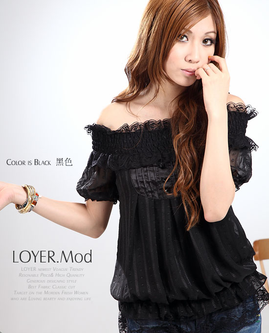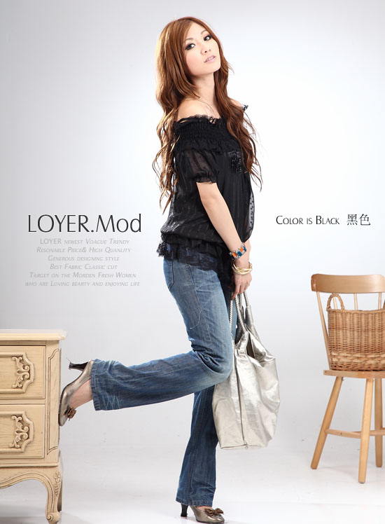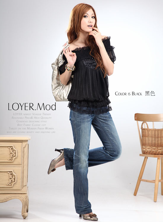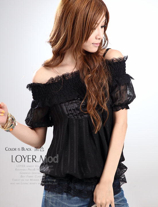 简单描述: 领口采用蕾丝松紧设计,主体利用提花面料,下部装饰以花边,可以有效的遮掩小肚子上的赘肉哦,非常实用的小上衣