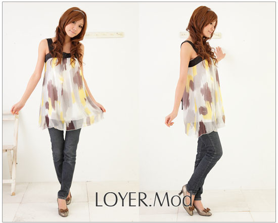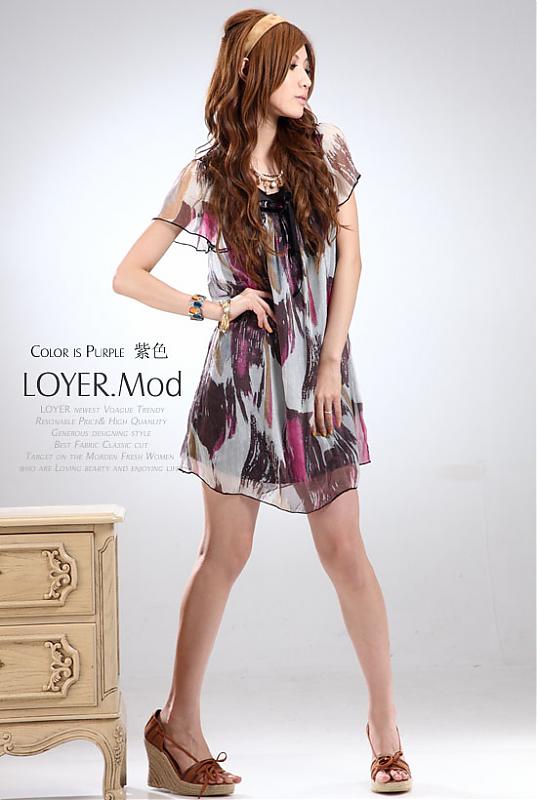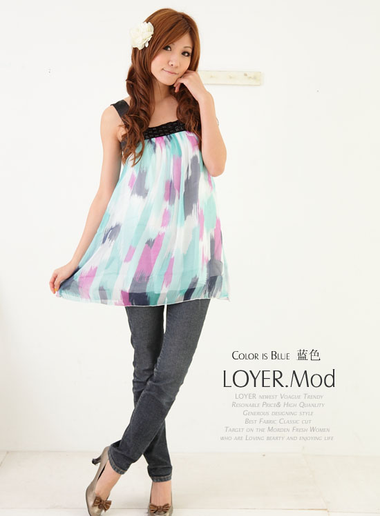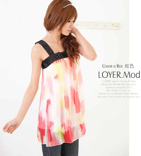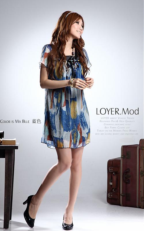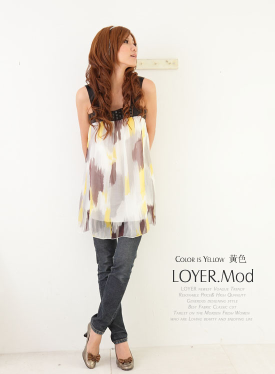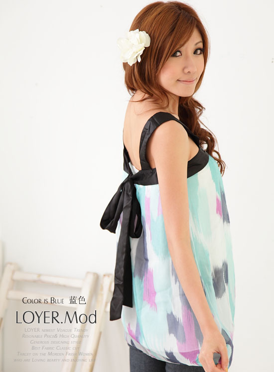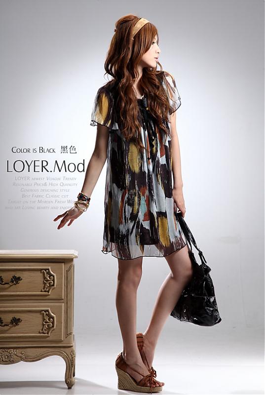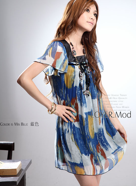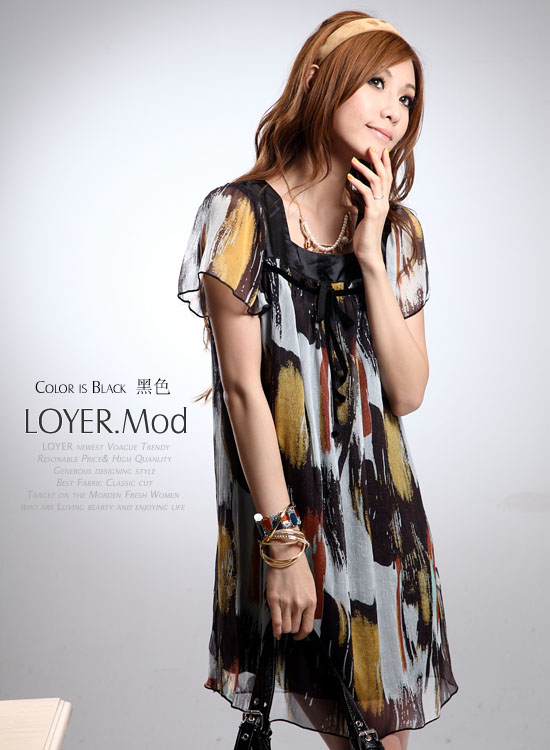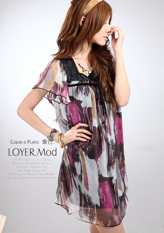 〖介绍〗:简单的款式采用抽象图案的面料,给人一种与众不同的感觉,胸前撞黑色仿真丝,神秘而夺目