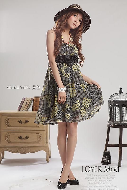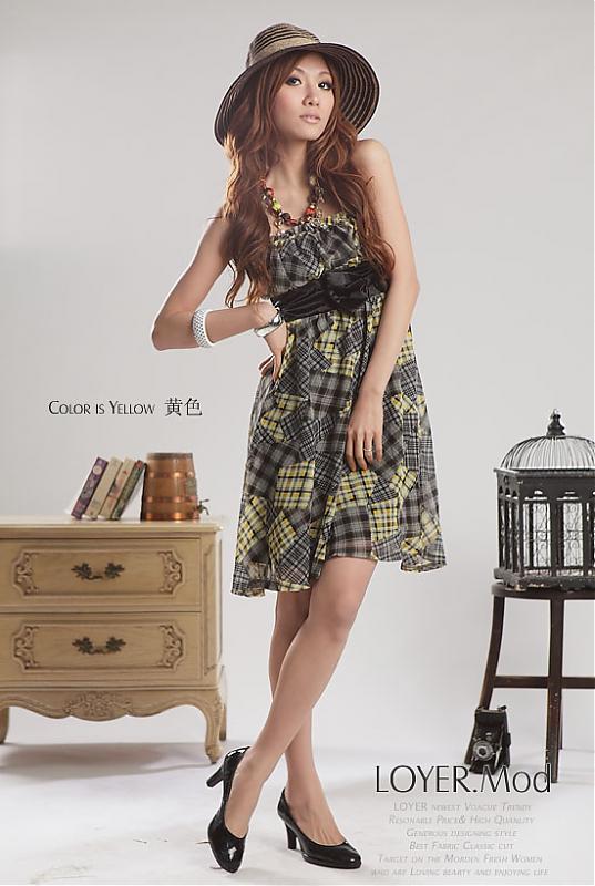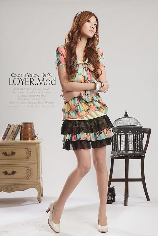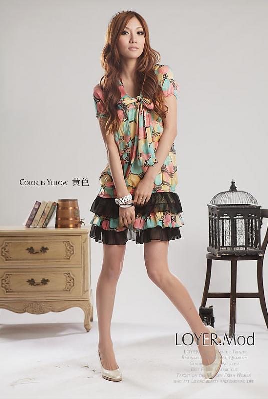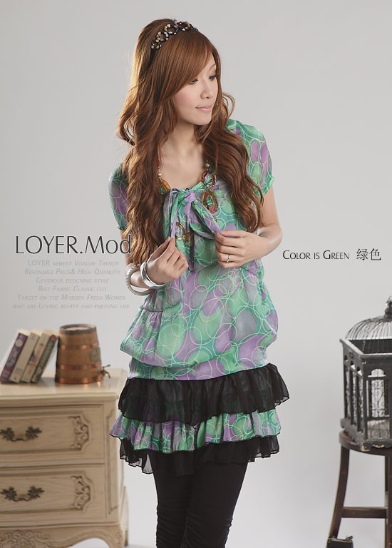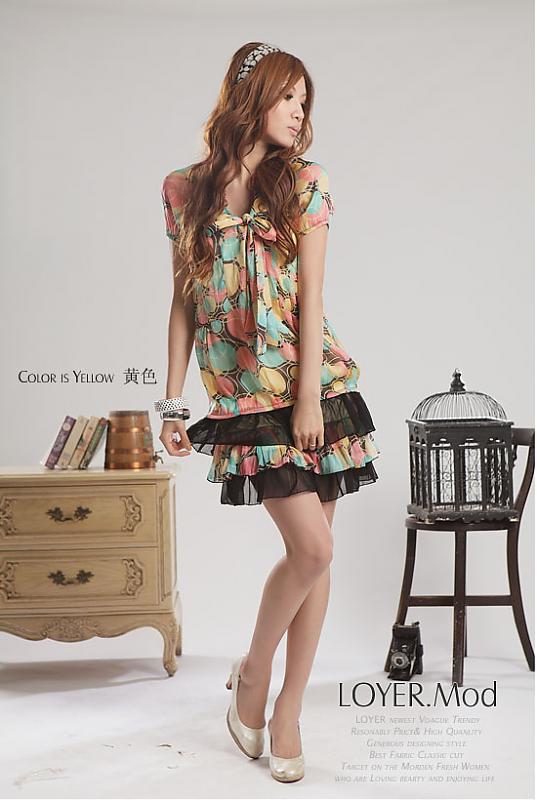 简单描述: 圈圈图案的两件套裙装,非常青春的颜色,胸前用系带蝴蝶结装饰,亮丽而不失俏皮