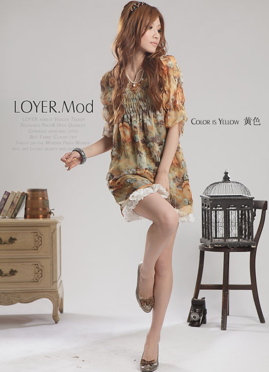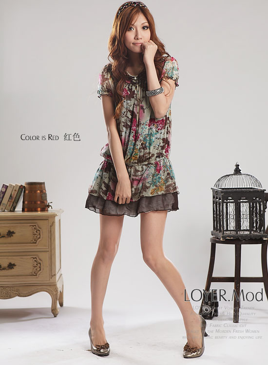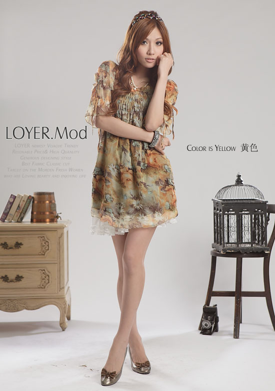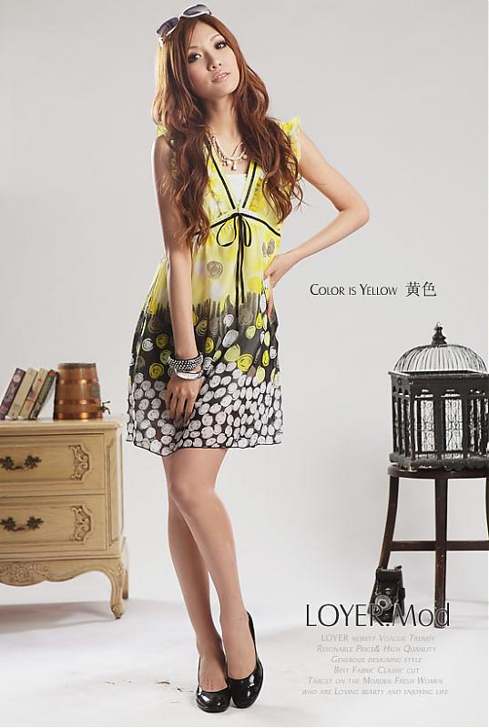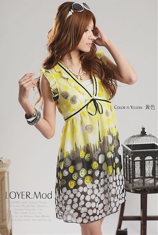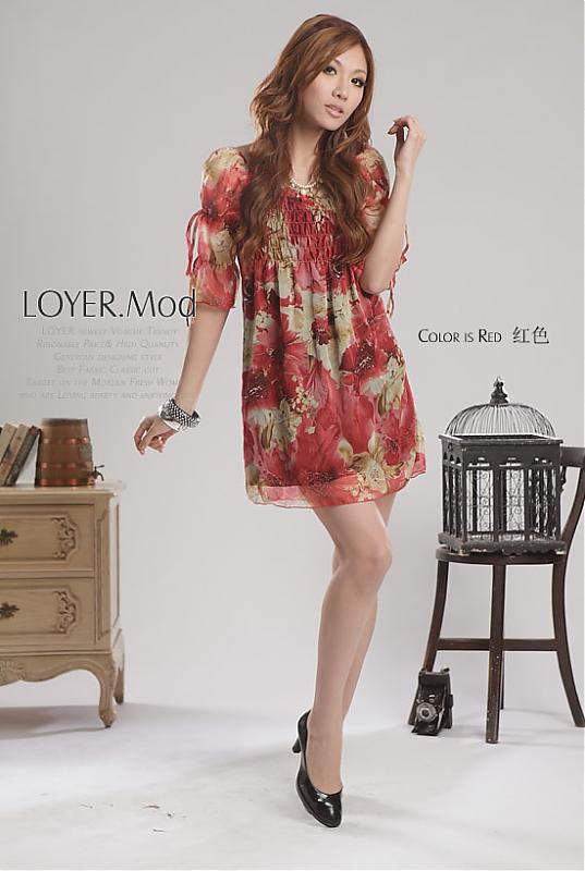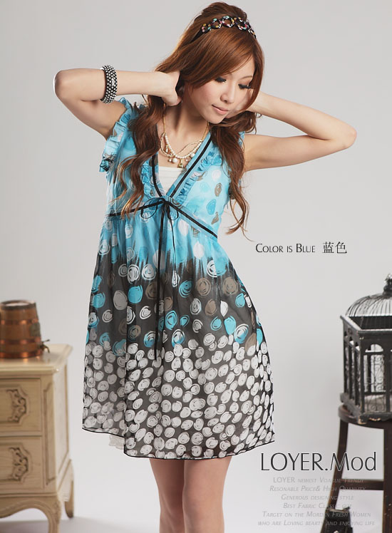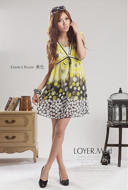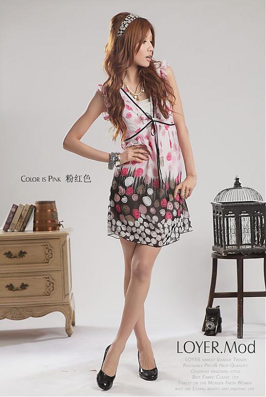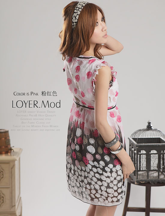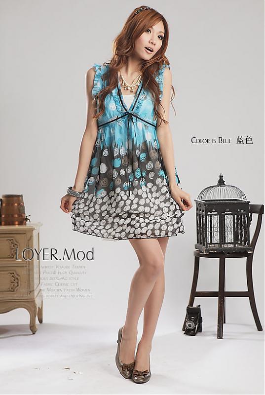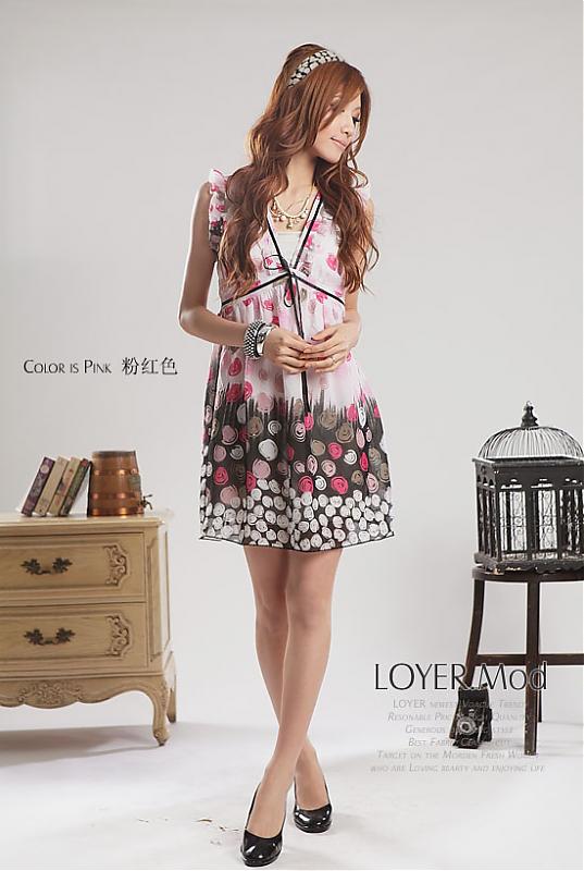 简单描述: 淡雅清丽的圈圈定位花图案连身裙,蝴蝶袖的设计可以遮掩略粗的手臂