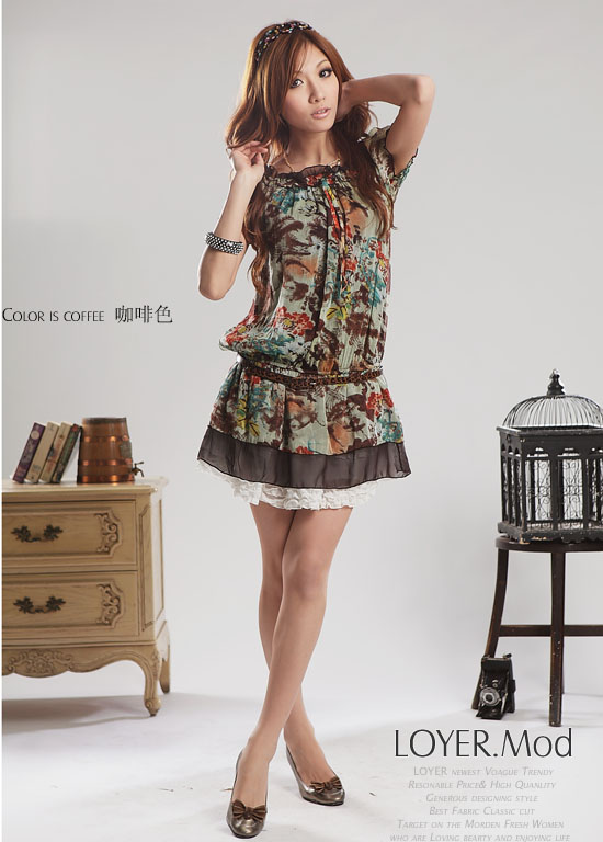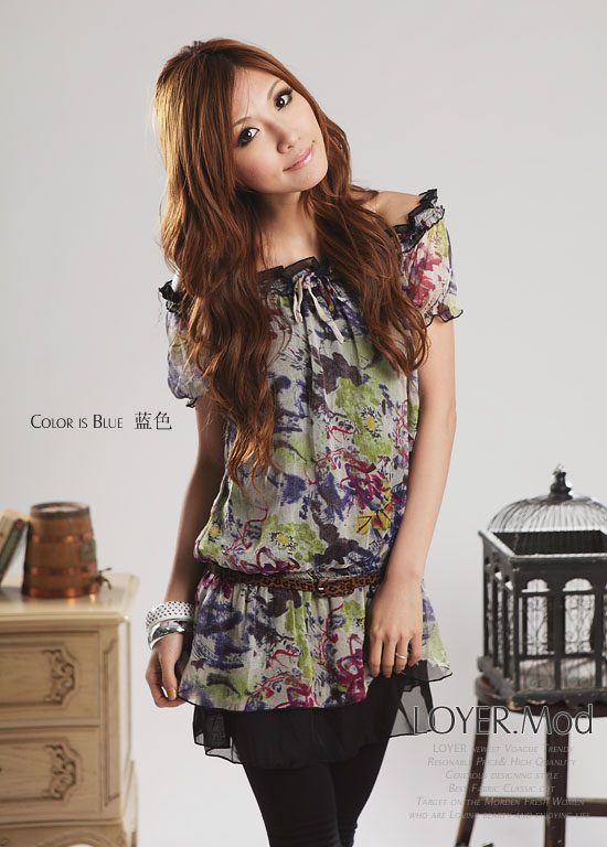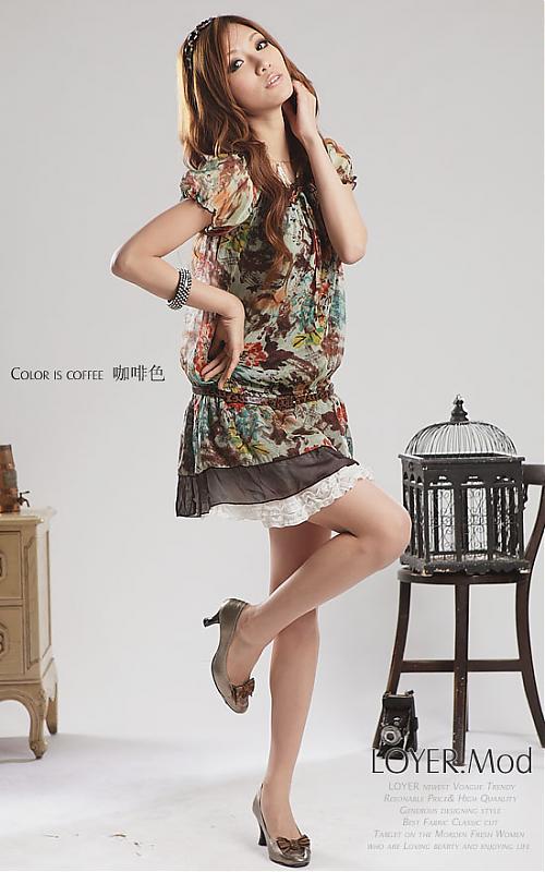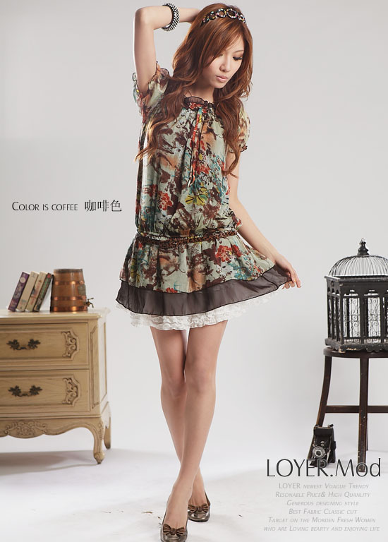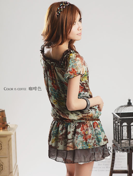 简单描述: 胸前抽绳,下摆配黑色花边,主体的抽象花朵图案和配送的豹纹皮带更增添了女人味