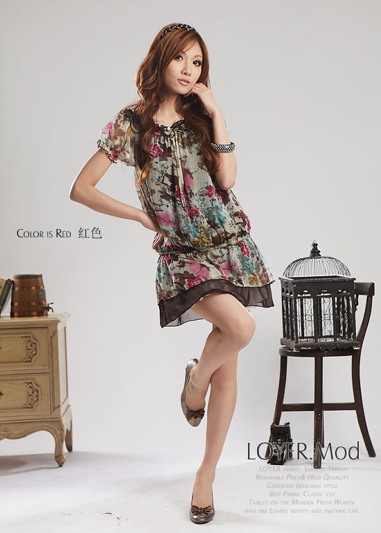 77. 抽绳一字领怀旧印花雪纺裙 ( 送皮带)