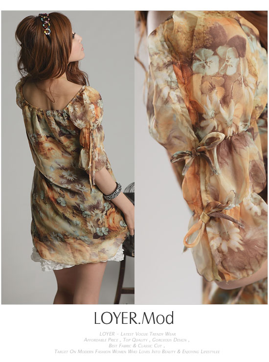 简单描述: 清爽的大花图案,胸前用松紧设计,弹力较大,袖子采用抽绳设计,非常有特点