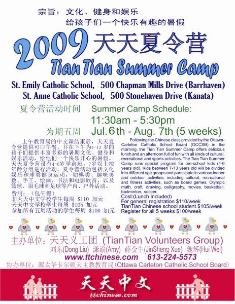 天天义工团在成功组办了2008年天天中文夏令营之后,今年夏天将再次与渥太华天主教教育局联合组办中文夏令营。教育局将负责上午两个小时的中文课,天天义工团负责中午饭和下午的文化、体育和娱乐活动,让孩子们渡过一个快乐和有意义的暑假。