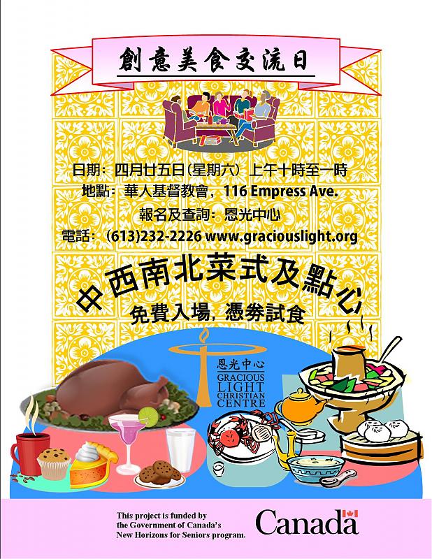 [FONT=新細明體]無論你喜愛烹飪或只是喜愛品嘗各地方的獨特小食,都歡迎你携同家人,一同參加恩光中心舉辦的[/FONT][FONT=新細明體]美食交流日,同來交流烹飪技巧及分享美食.[/FONT]