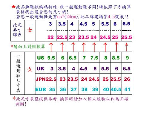 尺寸對照:#35=22.5公分,#36=23公分,#37=23.5公分,#38=24公分,#39=24.5公分,#40=25公分(參考尺寸 : 美麗小姐腳長剛好23公分 , 腳版正常 , 要穿35-36號較剛好 ; 可愛小姐腳長24.2公分 , 腳版廋長 , 要穿37-38號較剛好)