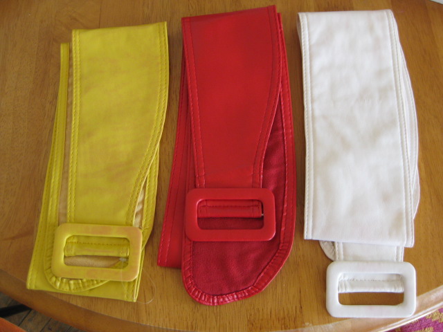 3条时装腰带,新的,每条$2。 新的职业装衬衫(with tag on),中号,$7。 (Sold) 新的衬衫(with tag on),中号,$5. 还有一件蓝色的,一摸一样,也$5。 smart set 牛仔西服,新的(with tag on),5号,很修身,$22。 新的黑色毛料短裙,腰围1.9-2.0尺,$6。