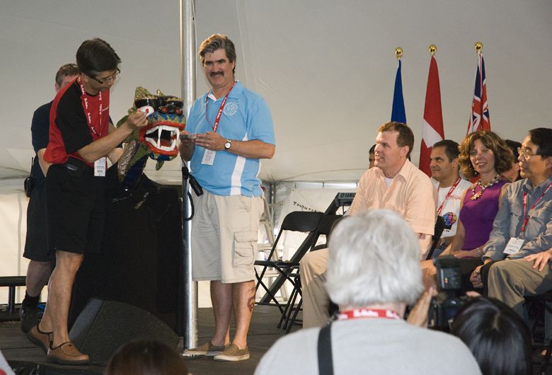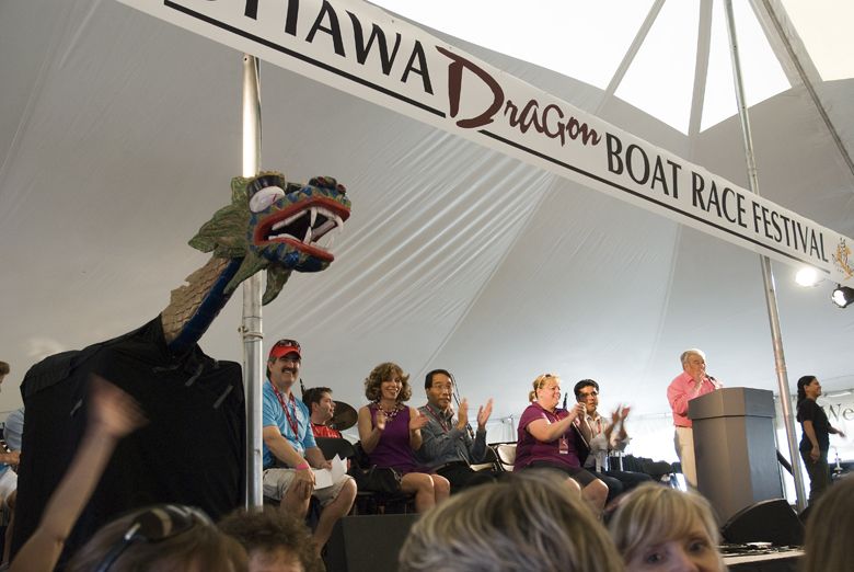 加拿大联邦国会议员、运输部长John Baird,安省议员Yasir Naqvi,渥太华市长代表,香港贸易促进会主席, 龙舟节组委会及捐款和受赠组织代表出席开幕式并发表讲话。大会上向龙舟节捐款的企业和组织颁发纪念牌,随后由捐款第一大户- Scotia Bank的代表为龙头点睛,象征龙舟节正式开始。