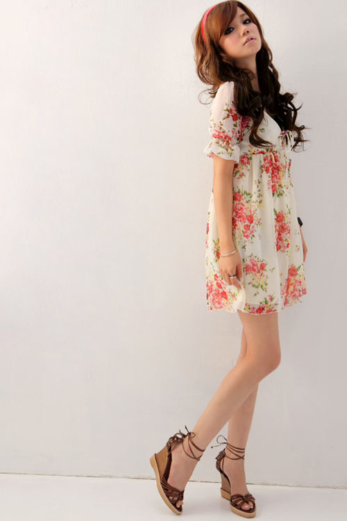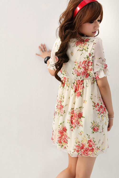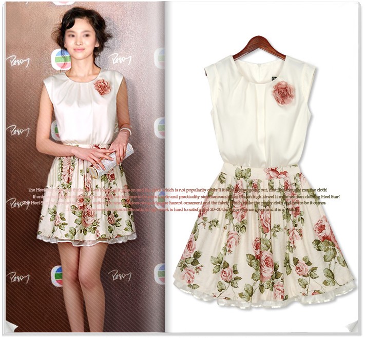 面料:仿真丝+棉 弹性:稍有 腰带:无 内衬:无 其他辅件:无 其他说明: 尺码:均码 胸围:平铺90CM 衣长:70CM 肩宽:-cm 袖长:-cm 腰围:70cm 宋慧乔推荐;圆领褶皱拼接花色洋装(送胸花) $25