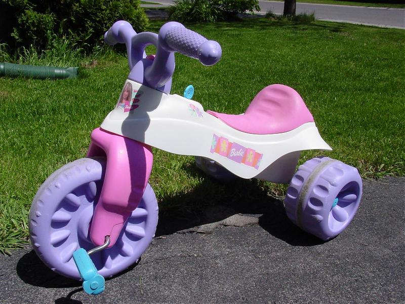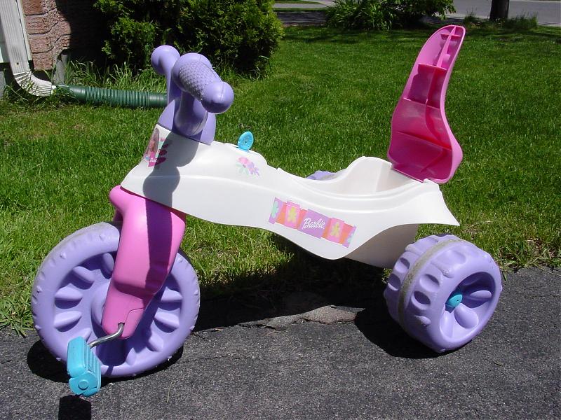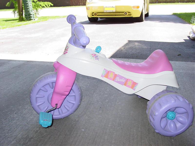 Barbie小三轮车,买的时候$60多。 $20. 座位下面是储物空间,可以放一些糖果、饮料什么的小东西。 Sears的介绍是: # oversized front wheel # rugged back wheels # pretend clicking ignition key # under-seat storage compartment # max. weight 55 lb.