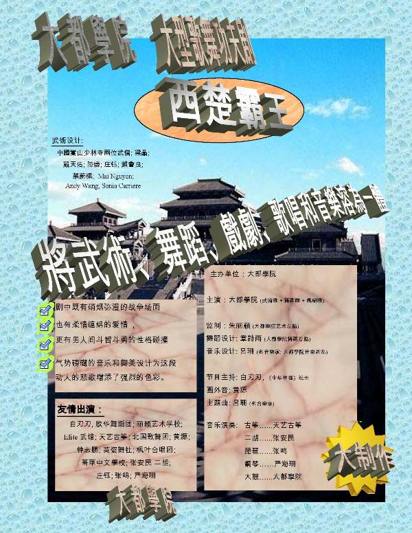 《Elite 武馆》;《武壇武馆》;《自成武馆》和 《大都學院》联合籌劃.......... 《大型歌舞功夫剧..西楚霸王 》