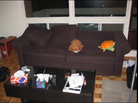 客厅摆放46寸崭新夏普超薄彩电,IKEA的茶几,3人沙发,电视柜(全部都是4个月新),房租一共1305,三间房间分别是480一个AC男孩住(15平米,因为,客厅除了电视和我平分,别的都他自己买的,所以房租便宜点)朝南,中号435(10平米)一个小女孩住朝南,小号390(8平米)朝南,本来我自己住,可是由于工作原因不能住了,房间基本是全新的.