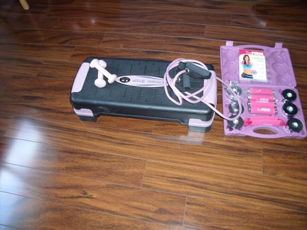 Stability ball (55''), a box of adjustable dumbbells, a set of 2lb dumbells, tube, and a step with 4 workout DVDs -- $30