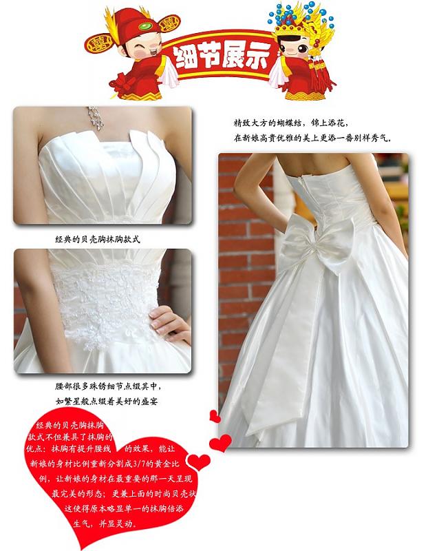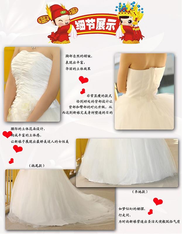 PS:关于婚纱礼服,我们有一些样板,如果mm有自己喜欢的礼服可以把图片发给我们然后把尺寸给我们都会尽量满足