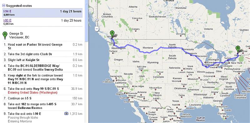 T theway 新手上路 注册 2009-06-30 消息 103 荣誉分数 1 声望点数 0 2009-09-10 #15 4 days 1 day Vancouver to Edmonton AB 2 day Edmonton to Winnipeg, MB 3 day Winnipeg to Thunder Bay, ON 4 day Thunder Bay to Ottawa, ON Everyday you will drive 10 hours, if you have 2 driver it will be ok.