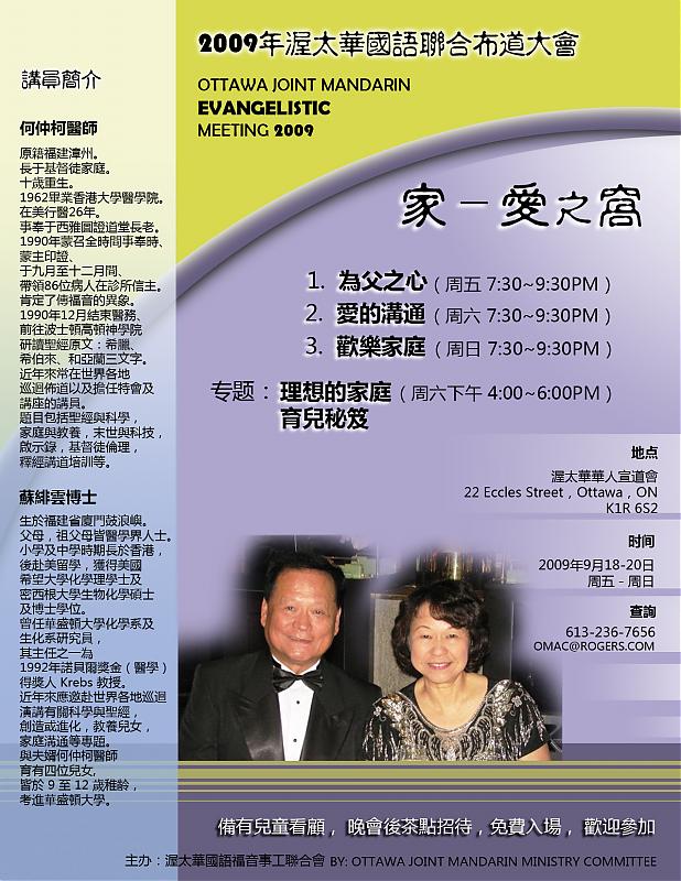 渥太華國語福音事工聯合會將於9月 18~20 日 (周五~周日) 晚上 7:30~9:30 在渥太華華人宣道會 (22 Eccles Street, 在唐人街) 舉辦 “家 -- 愛之窩” 國語佈道會, 講員為何仲柯醫師及蘇緋雲博士夫婦。分題為: (1) 周五晚: 為父之心 ; (2) 周六晚: 愛的溝通; (3) 周日晚: 歡樂家庭。另周六下午4:00~6:00並有二個專題講座: (1) 理想的家庭; (2) 育兒秘笈。聚會免費入場, 備有兒童看顧, 會後並有茶點招待 (周六下午講座沒有兒童看顧及茶點招待), 歡迎參加。查詢:613-236-7656; <omac@rogers.com>。
