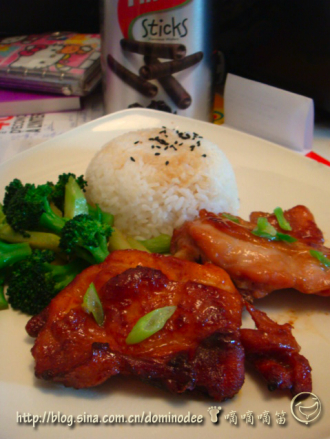 在烤鸡腿之前就可以把米饭放下去煮,然后西兰花过沸水,加盐摆盘.