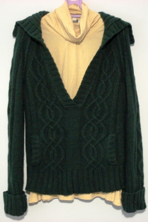 墨绿色厚毛衣,American Eagle的,$12; 里面嫩黄色打底衫:$5. 两件一起买,$15