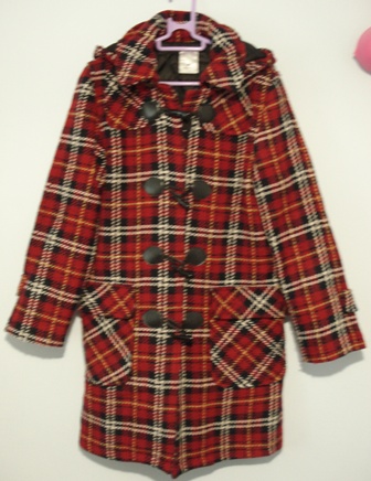 红色格子牛角扣:$30 (非常新,里面有薄棉夹层,保暖但不显臃肿)(sold)