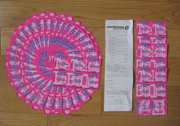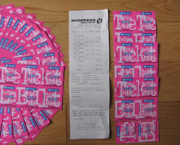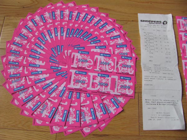 搬家转让车票,一共194张,每张$1.00,附买车票时的Reciept(09年6月24日购于Shoppers)。 30sheets+14张零票,6张/sheet,最少一次买2张sheets(12张车票) Ottawa Downtown 见面交易,只收现金。 有兴趣的请发QQH或call(613)799-3702,谢谢!