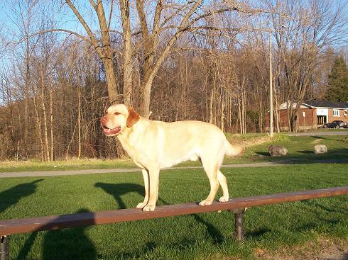 最近教会狗狗走平衡木了。一开始走得歪歪扭扭地,还总是掉下来;现在,piece of cake! :D