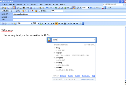 是的,你在写一封英文邮件,但是你遇到一个词“延迟”,一时想不起英文该怎么说了怎么办?双击Alt键就可以调出《谷歌金山词霸2.0》特别设计的“写作助手”功能,直接输入“延迟”,看看,都有哪些候选词: