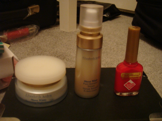 伊丽莎白.雅顿 丝亮白系列的晚霜(用了一点)还有精华(用了将近一半),送红色指甲油,一共$15,雅顿的原价都80多一瓶 玉兰油7重功效泡沫洗面奶,$10 长的心形项链买东西就送了 GEO没有度数的黑色放大彩瞳,正货韩国买的,黄标的,比白标的好很多,润很多,$25 还有一些小饰品等没有照,买东西就送