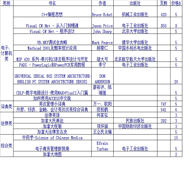 [FONT=宋体]书名 作者 出版社 页数 价格$[/FONT]