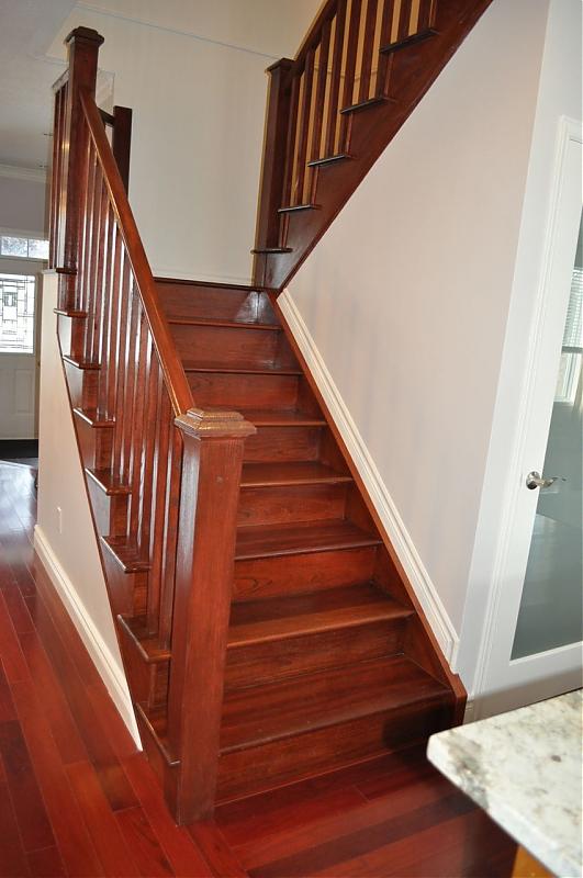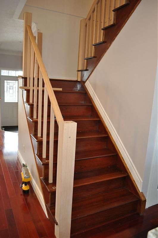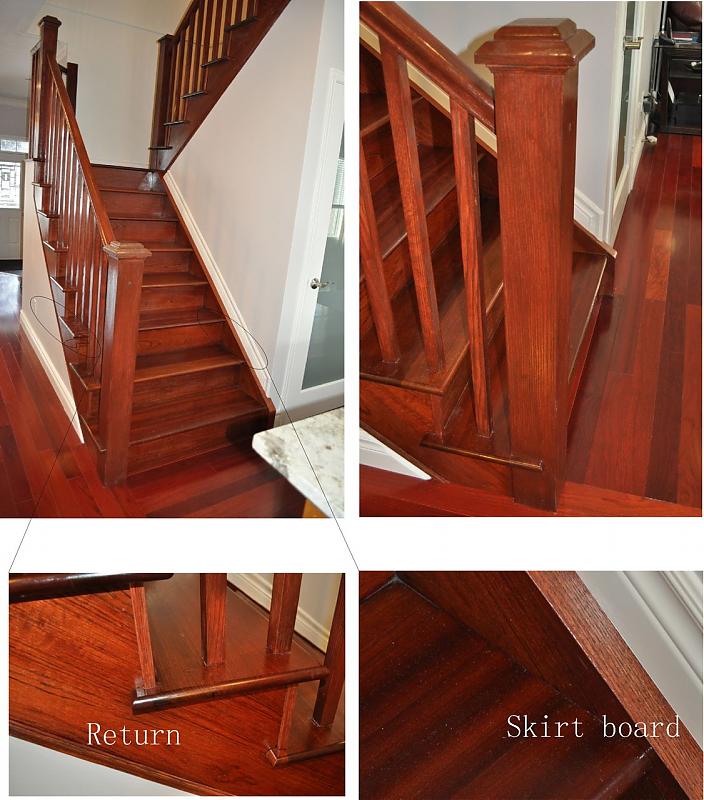 Woodlover 资深人士 注册 2011-06-02 消息 523 荣誉分数 152 声望点数 203 2012-07-15 #147 最近完成了让楼梯扶手和楼梯颜色一致的工作,我家LD一直想要现代派方形的newel post,乘此机会也一并实现了。 下面贴几張照片显示工程前、中、后几 张照片,并用图示介绍二个术语,stair tread return和skirt board。对于open stair case,注意这些细节能增加木楼梯整体的美观。