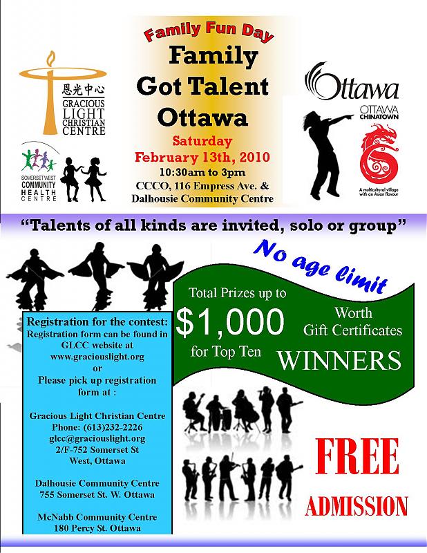 [FONT=新細明體]【潛龍伏虎演藝才華大賽】[/FONT][FONT=新細明體]參賽者需預先報名。十名勝出的優勝者將[/FONT][FONT=新細明體]合共獲得[/FONT][FONT=新細明體]價值[/FONT][FONT=新細明體]一千[/FONT][FONT=新細明體]多[/FONT][FONT=新細明體]元的禮品卷。才華大賽[/FONT][FONT=新細明體]報名[/FONT][FONT=新細明體]表格,可致[/FONT][FONT=新細明體]電恩光中心 613-232-2226 , 或[/FONT][FONT=新細明體]在[/FONT][FONT=新細明體] www.graciouslight.org[/FONT][FONT=新細明體]網址下載。[/FONT]