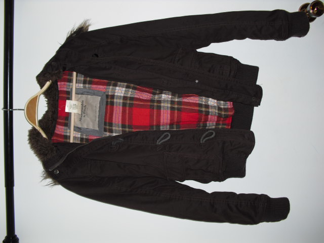 这是第一次在网上卖衣服, 以前都是买。我这里有两件棉衣, 两条牛仔裤,一件针织衫,还有一件及其性感时尚的长款包臀T (可当裙子)还有一些其他的,不一一罗列。 照片是我这个飞专业的人拍的,实际上,衣服比这个要好看很多。所有衣服都是从国内刚刚邮寄过来的, 在网上采购的, 加上运费,也花了不少银子, 衣服的质量都很不错, 款式更是不用罗嗦, 时尚。 1。 这件大家都知道是AF的牌子,但肯定是仿制的,是当季买的,所以价格不菲,再加上运费,可以想象。 衣服是咖啡色的,永远的潮流, 很适合冬季,是棉衣,但不是很厚道那种, 牛角扣子, 后面的帽子非常之强大,穿上后很有明星的感觉,冬天更是有勇武之地。 这件我穿大了,是M号的,但是偏大,适合160以上的穿着。 价格是 45