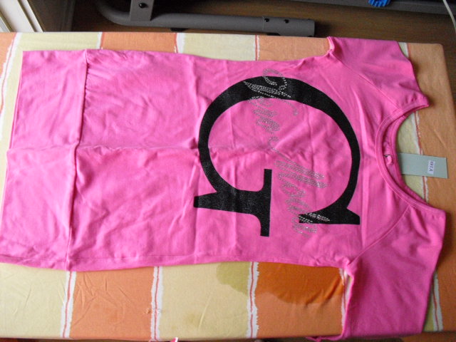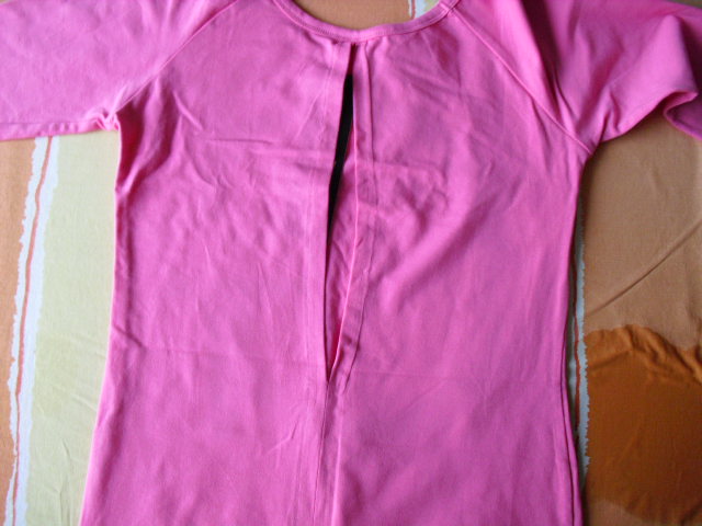 这件是纯棉的, 长度有78厘米, 是中袖,弹性非常之大,不是那种很薄的棉,而是很厚实的,很有质感的。 后背是开都的,露出后背,很性感, 前面是闪亮的银色装饰,那个大G 也是黑色的带闪粉的那种,总之特别的时髦。实际上我买了两件同款式的,只是不同颜色,另一件是黑色, 这件我穿实际是有些紧,由于粉色是膨胀色,如果我穿粉色很紧,就很显胖,黑色就还将就,由于是太爱了,所以就瑕疵一回,还是穿了黑色的。 这个适合胸围88 左右的,但是有弹性,可以根据自己的喜好来选择。 价格是吉利的数字 18 。实际上这个颜色比照片要粉很多,是很水灵的粉。