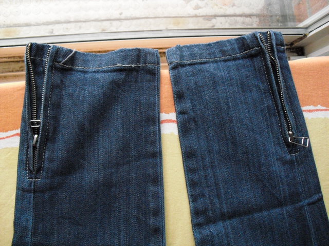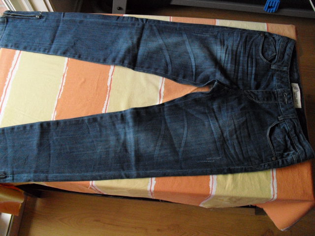 这条牛仔裤,是最新最新的款式,也是当季的流行,小脚和直筒两穿啊。深蓝家磨白做旧,屁屁上的口袋有特殊凹凸处理,很时尚, 大腿的两侧有磨破处理,是THURSDAY ISLAND 的原单裤子, 最经典的就是裤脚的拉链设计,我当初就是被这个亮点所吸引。 拉起来是小脚裤,潮流,也适合穿靴子,打开拉链就是直筒裤子, 效果截然不同。 另外这个裤子还有些弹性。大家都知道了,穿很硬没弹性的裤子很难受。 这个是29的, 腰围75厘米, 大腿围52 臀围96. 价格是25