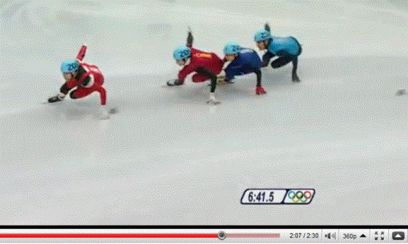 韩国选手从右脚打滑,到彻底摔倒还有一定时间和调整的余地,他的左脚已经落地,可以提供更大的控制面和转移重心的动力,可是他没有升高中心,降低速度,试图调整平衡,而是试图阻挡和拉住加拿大选手,其心何其毒也。 不仅失金牌 而且失奖牌,也在情理之中。