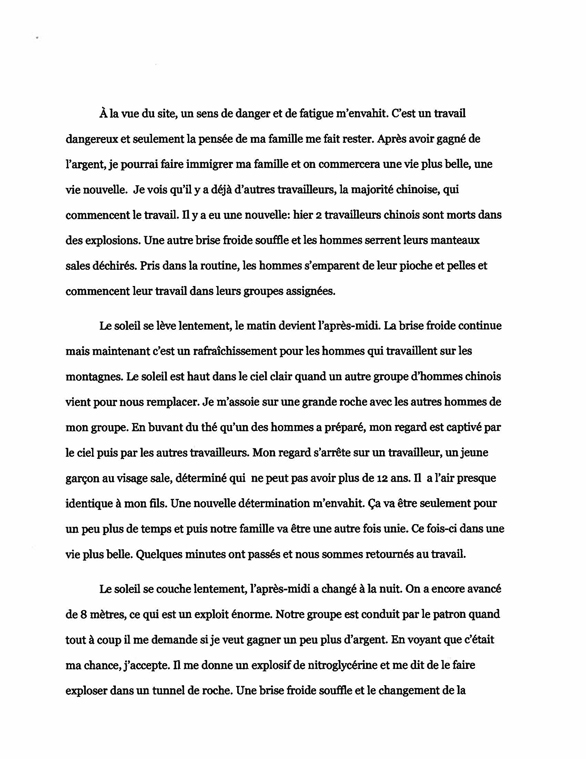 A sense of danger filled me when I saw the site. It was a dangerous job but the thought of my family made me stay. After earning more money, I could immigrate my family here and we would start a new and better life. I saw that there was already workers starting their work, mostly Chinese. There was more news, yesterday 2 Chinese workers were killed in explosions. Another breeze blew and this made the men tighten their ripped, dirty shirts. They grabbed their pickaxes and shovels and started to work, in assigned groups.