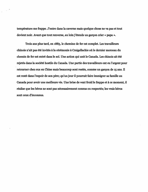 3 years later, in 1885, the railroad was complete. The Chinese workers were not invited to the ceremony at Craigellachie where the last piece of the Canadian Pacific Railway was placed. It was an action that united Canada, from east to west. The Chinese workers were rejected in the hostile society. A small part of the workers had enough money to return to China but a lot stayed, including a boy of 15 years old. He stayed to continue the goal of his father; that one day he would be able to immigrate his family to Canada for a better life. A cold breeze hit him and at that moment, he realized that heroes are not necessarily known or respected; real heroes are those of the unknown.