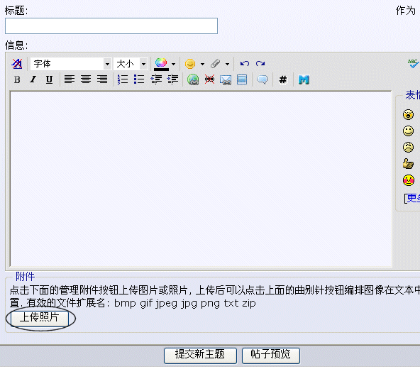 B bubbles 新手上路 注册 2009-10-14 消息 37 荣誉分数 0 声望点数 0 2010-03-22 #1 想上传两张照片, 可不知道怎么做.提示说 "点击下面的管理附件按钮上传图片或照片",哪个是那个按纽啊? 请各位指教.先谢谢啦.